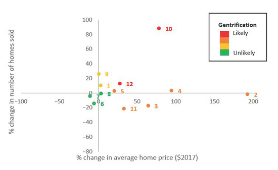 Likelihood of gentrification based on percent change in average home prices and number of homes sold between 2000–2004 and 2013–2017 for the 12 CBGs that surround the KUW. Notes: See Figure 6 for the location of the CBGs by id. Source: Knox County Property Assessor data obtained from KGIS.
