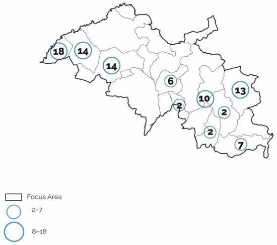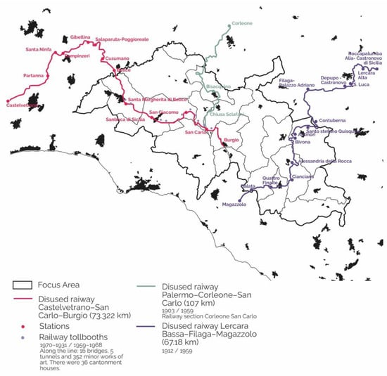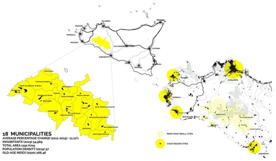 Within the framework of the B4R research project, the Research Unit of the University of Palermo explores the small towns and their communities in the Sicani territory in Southern Sicily (B. Lino and A. Contato have been involved in research activities of the Local Development Laboratory (SicaniLab) of the ‘Polo Universitario di Ricerca di Bivona e Santo Stefano Quisquina per l’energia, l’ambiente e le risorse del territorio’. The SicaniLab, coordinated by Professor Maurizio Carta, carried out a research in the Sicani Inner Area and different studies for territorial and local development. See: Lino, B. [2017] A New Rur-Urban Utopia? Social innovation and the case of the Sicani area in Sicily. In Territories. Rural-Urban strategies; Schröder, J.; Carta, M.; Ferretti, M.; Lino B. (Eds.); Jovis Verlag GmbH: Berlin, German, pp. 110–117; Contato, A. [2018] ‘The Peripheri-City of the Inner Areas: Local Development in the Sicani Territory’. In Dynamics of Periphery. Atlas for Emerging Creative Resilient Habitats; Schröder, J.; Carta, M.; Ferretti, M.; Lino B. (Eds.); Jovis Verlag GmbH: Berlin, German, pp. 192–199) [,]. The Focus Area (FA) is composed of 18 municipalities and located halfway between the cities of Palermo and Agrigento from north to south and between the cities of Trapani and Caltanissetta from west to east, as shown in Figure 1.
