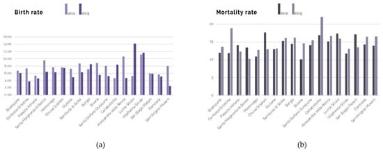 (a) Evolution of the Focus Area municipalities’ birth rate during the period 2010–2019; (b) evolution of the Focus Area municipalities’ mortality rate during the period 2010–2019. Data processing (ISTAT, 2020) and graphics: Barbara Lino and Annalisa Contato.