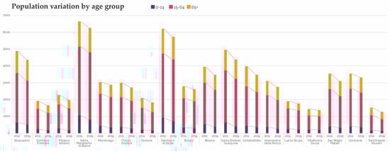 If we look at the variation in the population by age group (Figure 3), we can observe a decrease in all age groups; however, particularly significant is the decrease in the active population groups (15–64 years), which are increasingly forced to move for reasons of work or greater accessibility to basic services.