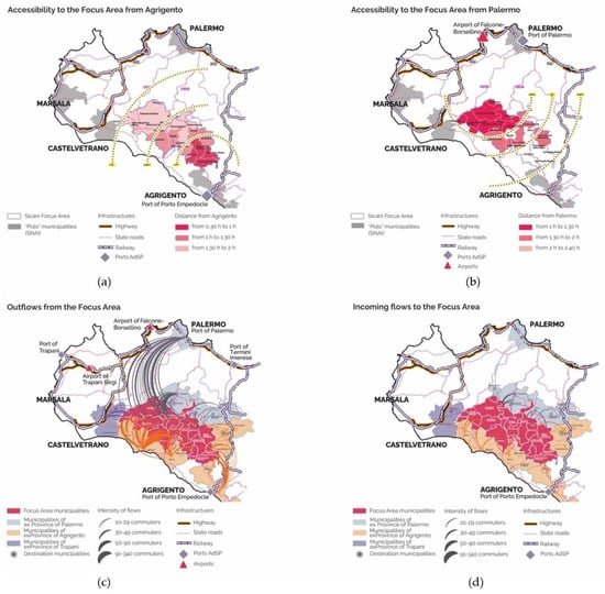 (a,b) Accessibility to the Focus Area from the main urban centres; (c,d) The movement of commuters for study and work inside and outside the Focus Area. Data processing (ViaMichelin, 2021 and ISTAT, 2011) and graphics: Barbara Lino and Annalisa Contato.