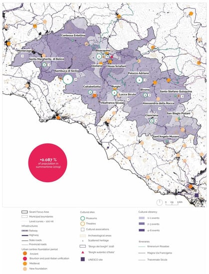 The data that support the findings of this study are derived from on field research and resources available in the public domain. Data on “One euro houses” have been provided by Municipality of Sambuca di Sicilia and data on tourism by Osservatorio Turistico-Geoportale Sicilia-del dip. Turismo, Sport e Spettacolo-Regione Siciliana (2019) for this study. About other data sources analyzed during the study see: ISTAT (2020), https://www.istat.it (accessed on 10 March 2021); CTR Regionale Sicilia (1999), https://www.sitr.regione.sicilia.it/cartografia/carta-tecnica-regionale/, (accessed on 22 December 2021); Linee guida del Piano Paesaggistico Regionale (PTPR) (1999) Sicilia, https://www2.regione.sicilia.it/beniculturali/dirbenicult/bca/ptpr/LineeGuida.pdf, (accessed on 22 December 2021); Sistema Informativo Territoriale Regionale Sicilia (2021), (accessed on 22 December 2021); TINITALY (2021), http://tinitaly.pi.ingv.it (accessed on 22 December 2021); Copernicus-CORINE Land Cover (2018), https://land.copernicus.eu/pan-european/corine-land-cover/clc2018 (accessed on 22 December 2021); ViaMichelin (2021), https://www.viamichelin.it (accessed on 15 April 2021); Borghi Autentici d’Italia, https://www.borghiautenticiditalia.it (accessed on 2 December 2021); Agenzia Nazionale per l’amministrazione e la destinazione dei beni sequestrati e confiscati alla criminalità organizzata (2022), www.benisequestraticonfiscati.it (accessed on 3 January 2022); Ferrovie abbandonate (2022), www.ferrovieabbandonate.it (accessed on 3 January 2022); Comuni Italiani (2021), http://www.comuni-italiani.it (accessed on 23 December 2021); Opencoesione (2021), https://opencoesione.gov.it/it/ (accessed on 23 December 2021).