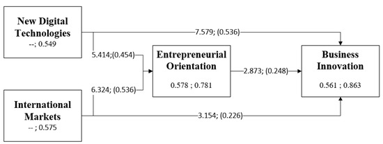 The structural path in Figure 2 and the results of Table 5 showed a positive and significant relationship between digital technology and business innovation (β1 = 0.536, t = 7.579, p < 0.001), indicating that H1 is supported. Also, the results showed a positive and significant relationship between digital technology and entrepreneurial orientation (β4 = 0.454, t = 5.414, p < 0.001), indicating that H2 is supported. Also, international markets have a positive and significant effect on business innovation (β3 = 0.226, t = 3.514, p < 0.001), meaning that H3 is supported. Also, the results showed a positive and significant relationship between international markets and entrepreneurial orientation (β4 = 0.536, t = 6.324, p < 0.001), indicating that H2 is supported. The path of entrepreneurial orientation in business innovation was positive and statistically significant (β2 = 0.248, t = 2.873, p < 0.001), so H5 hypothesis is supported.