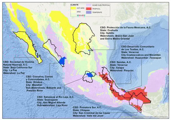 This study selected seven CSO-watersheds initiatives, comprising the cases in which experience has been developed to construct a watershed-city relationship. The watersheds are: La Paz watershed (South Baja California), Baluarte and Presidio rivers (Sinaloa), Bravo-San Juan and Sierra Madre Oriental (Coahuila), Laja river (Guanajuato), Pixquiac (Veracruz), Coatzacoalcos and Minantitlán (Veracruz) and Valle del Jovel (Chiapas). The distribution of the watersheds where CSOs work covers different climatic zones of Mexico, from the hot arid zone in the north (1 watershed), arid zone (1 watershed) to humid subtropical zone in the center and south (3 watersheds) and the tropical zone in the southeast (2 watersheds) (Figure 1). All the CSOs have a local scope, and clear principles that oriented their activities, e.g., “pal”, “protect and restore the hydrological and ecological functions”, “rural development with justice”, “linking cities users of the water supply”, “establishing strategic alliances and participating in networks with academia, government, private initiative and civil associations for the conservation and sustainable management of Mexico’s biodiversity”.