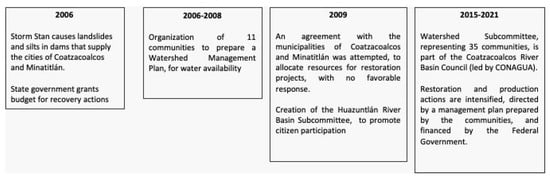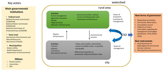 In Latin America, the concern for activities of watershed management has historically been concentrated in rural areas. Mexico has broad watershed management experience in a rural context [18,19,20] emphasizing governance in the communities in order to improve the state of their ecosystems and productive activities. Currently, the main challenge is engaging the cities in the watershed management processes, which will require creating new spaces of collaborative governance [14].