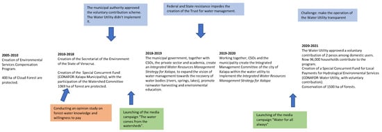 In the city of Xalapa, the common interest in preserving natural resources prompted the preparation of a participatory diagnosis of the watershed’s problems, which led to the creation of the Pixquiac Watershed Committee (Cocupix) in 2006. This citizen platform integrated diverse stakeholders, inhabitants of the sub-basin, private landowners, ejidos, producers, CSOs, and academics. From Cocupix, the CSO sought dialogue with government agencies of the City of Xalapa, as a beneficiary of environmental services. Ten years’ work made it possible to create, together with the city council and the municipal water utility, the Environmental Services Compensation Program (PROSAPIX), an instrument that uses the city’s budget to the conserve and restore areas that provide environmental services was supported. In addition, investments have been made in productive projects to reduce pressure on natural resources, generate real economic alternatives, and encourage inhabitants to stay in their communities. Rural participation is currently low due to clientelism relations, typical of local idiosyncrasy. The steps followed by the CSO to institutionalize the payment for environmental services program are explained below.