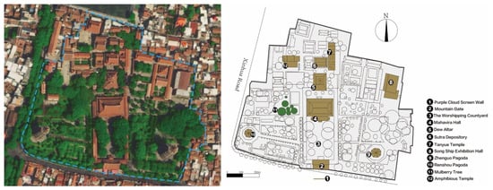 - Wei, L.; Wang, L. Research on integral Protection of Urban Temple Gardens—A Case study of Guodusi Temple in Wuhan city. J. Huazhong Agric. Univ. 2016, 35, 50–54. (In Chinese) [Google Scholar]
