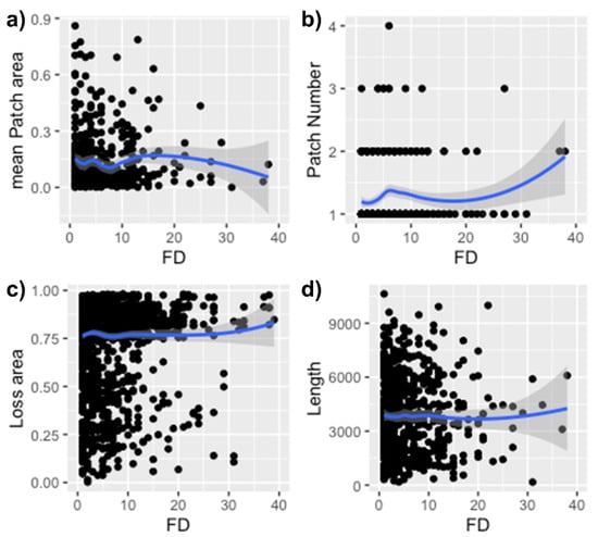 Figure 1. Scatter plot with fragmentation metric and fire density (FD) with LOESS regression. A gentle declining association is found between FD and (a) mean patch area (after an increase). Strong positive association between FD and the (b) number of patch areas (especially with values greater than 30. Slight positive association between FD and (c) loss area and (d) length.