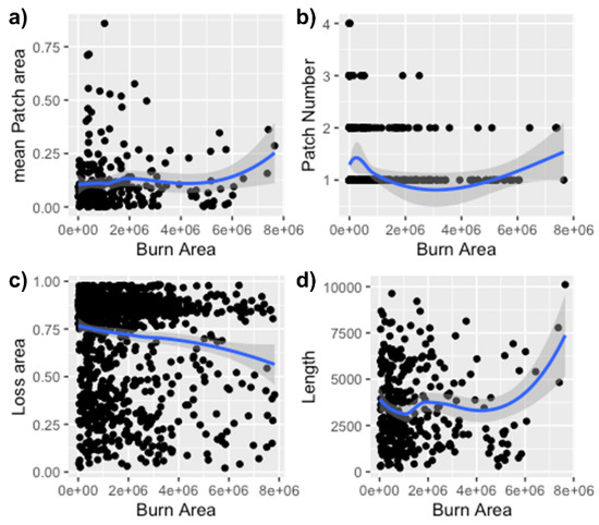 Figure 2. Scatter plot with fragmentation metric and burned area with LOESS regression. The burn has a parabolic positive association with (a) the mean patch area, (b) patch number, and the (d) length but has a negative association with (c) forest loss area.