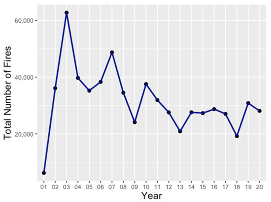 The Mann–Kendall test revealed that the annual FD is tau value −0.368 with a p-value of 0.025, which confirms the negative trend in the area during the considered two decades. For the mean annual FRP, the tau value is 0.4 with a p-value of 0.014. The mean annual FRP had an increasing trend from 2001 to 2020, indicating an increase in fire intensity.