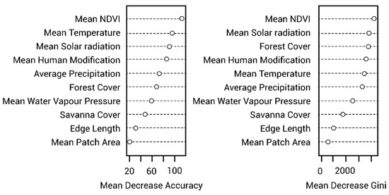 Figure 6. Mean decrease accuracy (MDA) and mean decrease in the Gini coefficient (MDG) of each predictor in the RF model.