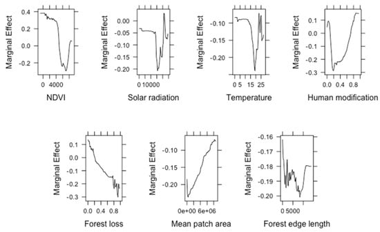 The partial dependence plot for the most influential variables and fragmentation variable is shown in Figure 7. The marginal effect depends on Class 0, which is a non-fire class. A positive value on the y-axis represents a high probability to predict the non-fire class than a negative value. Among the four most important predictors, NDVI has a negative relationship with Class 0 when it is less than 7000 and increases after 7000. The probability of Class 0 has a nonlinear relationship with solar radiation, which is similar to the temperature trend. Human modification has a positive correlation with the marginal effect when the value is over 0.2. The fragmentation variables used in the RF model were forest loss, mean patch area and forest edge length. Meanwhile, forest loss is the third important variable in the model, and it is negatively related to Class 0, which indicates that land with a large proportion of loss area is likely to be predicted as Class 1. The mean patch area has a positive relationship with Class 0, and low patch area values have high probabilities to be predicted as Class 1. The forest length has a nonlinear relationship. The probability for predicting Class 0 is negative, which shows that the data points with forest loss are prone to fire.