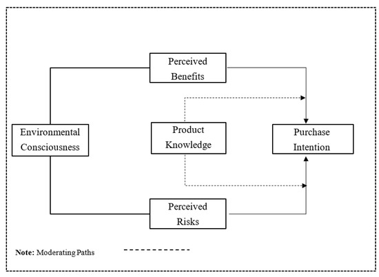 PR is the apprehensions of a consumer while considering a specific purchasing activity [60]. It negatively impacts various decisions, like investing in diverse assets, entering the employment market, or purchasing any product [61]. PR varies from product to product [32] and is often investigated as a multifaceted and complex construct [32,49,62] that affects consumers’ PI. The previous literature [21,22,24,25] supports that PR negatively affects the consumers’ PI. The positive influence of constructs like a green wash, personality traits, word of mouth, green awareness, and product knowledge on PI is reduced when PR is introduced as a mediator in such relations [63,64,65,66].
