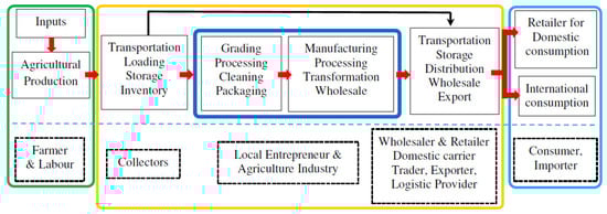 Figure 2 depicts the general supply chain of the Thai agricultural system, consisting of the upstream, midstream, and downstream. The main activity in the upstream concentrates on cultivation, involving many key players such as farmers, input sellers, and agricultural workers. The main activities in the medium stream of the supply chain are the collection of agricultural products, transportation, and distribution, and the processing ranging from simple agricultural processing to agro-industrial processing. Therefore, the essential stakeholders in the middle stream of the supply chain include multiple players (i.e., local collectors, middlemen, local and sizeable agricultural product processors, wholesalers, retailers, exporters, traders, and domestic and international service and logistic providers). The downstream activity in the supply chain involves the domestic consumption, importing, and distribution of agriculture and food products to overseas consumers. The red arrows indicate the flow of agricultural goods from upstream (producers) through food processing and delivery to downstream (consumers). At the same time, a portion of agricultural products in fresh agricultural products is directly sent to consumers without the processing of local entrepreneurs and the agriculture industry, indicated with a black arrow.