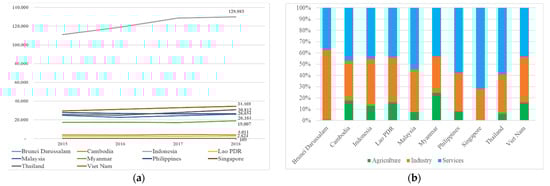 (a) GDP Based on Agriculture at Current Prices in USD in ASEAN, 2015–2018 (million USD), (b) GDP Share of Agriculture Sector 2018 (%). Source: adapted from ASEAN Statistical Yearbook 2019, ASEAN Secretariat, 2020.
