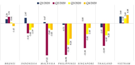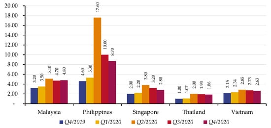 Figure 4 shows the unemployment rate of five ASEAN member states—Malaysia, Philippines, Singapore, Thailand, and Vietnam—in Q4/2019 and Q1 and Q2/2020. The unemployment rate in these countries gradually increased, particularly the Philippines in Q4/2020, which had an 8.7% unemployment increase, followed by Malaysia (4.8%), Singapore (2.86%), Vietnam (2.63%), and Thailand (1.86%). Because of the declining number of full-time and part-time jobs and the increasing unemployment in many industrial and service sectors, most of the labor force returned to their hometowns, working in the agricultural sector. If they were skilled agricultural workers, the move would lead to higher agricultural employment and productivity. On the other hand, unskilled agricultural workers had little chance to improve their situation and were burdened with their daily expenses.