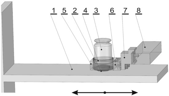 View of the attachment with the instrumentation for measuring kinematic friction: 1—attachment base, 2—analyzed sample, 3—weight, 4—sample and weight seat, 5—disassemblable sample pushers, 6—disassemblable sample pusher-fixing part, 7—pusher mounting, 8—movable texture analyzer arm with a load cell.