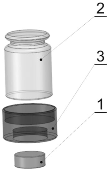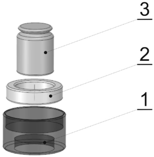 View of the disassemblable sample pusher: 1—sample and weight seat, 2—reduction ring, 3—weight.
