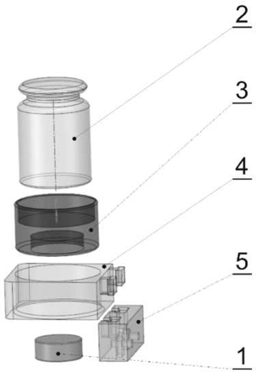 View of the disassemblable sample pusher: 1—analyzed sample, 2—weight, 3—sample and weight seat, 4—disassemblable sample pusher, 5—disassemblable sample pusher–fixing part.