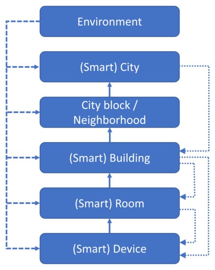 Our research identified two main challenges, both leading to a multi-scale, multi-attribute, multi-objective approach. The first challenge is that a city needs to be understood on several different layers that are interconnected by feedback loops and relations that may span over several layers, as described in [13]. Similar to other complex systems, applying reductionism is not helpful, as important interconnections cannot be understood and evaluated using this paradigm. Figure 1 shows the underlying concepts. A city is made up of heterogeneous blocks or neighborhoods, which often are as much defined by their social attributes as by their technical attributes. The potentially smart buildings have rooms in which devices are placed. The environment influences all, but there are additional interconnections, such as a building in a smart city, where power consumption needs to be reduced and the building utilizes the devices, either in competition or in alignment with room controls. While planners are not interested in providing smart devices, they are interested in the effects that can be discovered through the addition of smart devices.