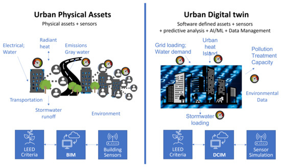 Systems engineering developed the concept of digital twins in model-based engineering to support engineers in the design and governance of complex systems [5]. A physical twin, the system of interest, is accompanied by a virtual twin, a computer representation of all important aspects and behavior of the system which is often in the form of a software agent, such as described in [6]. Digital twins help support feasibility evaluation during the requirements analysis and initiation phase. Particularly, they allow conducting trade-off analyses and experiments without the need to have the actual system in operation. In the development phase, the virtual twin is used in support of specifications, helping to reduce ambiguities. In the operations and maintenance phase, the physical system is connected to the virtual representation through sensors so that the digital twin contains all the data that can be used to monitor and improve the physical counterpart in real time and through longitudinal analysis of the data [7]. The recently published reviews of digital twin potentials for cities [8,9] provide more detailed examples.