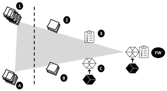 We start by using two systematic literature surveys conducted in earlier studies in the field of green metrics (1) [18] and a second one regarding simulation and sustainability (A) [19]. In our first step, we are focusing these earlier results of these surveys to provide a basis of articles applicable to measure sustainability in practical applications (2) and on articles focusing on digital twins (B), as described in the next paragraph. The second step is the identification of applicable metrics (3) and applicable digital twins (C), which are then combined into the proposed framework (FW) combining the two branches.
