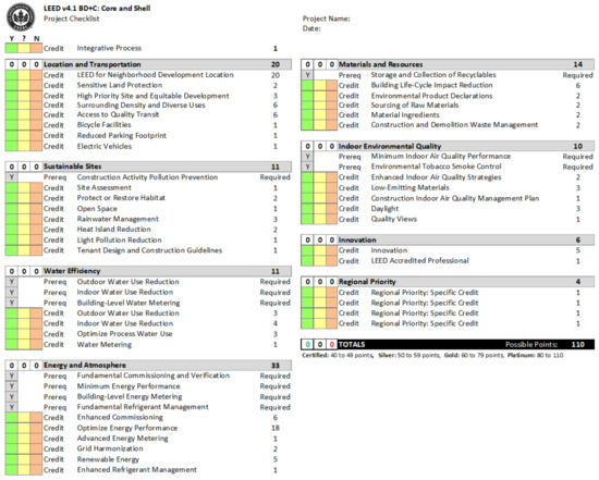 - U.S. Green Building Council. LEED Score Card. 2021. Available online: https://https://www.usgbc.org/leed-tools/scorecard (accessed on 26 December 2021).