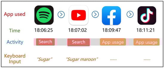 - Browsing or using app behavior (App Usage). AWARE cannot capture the screen of a user’s mobile phone. Therefore, in the log data, when a user unlocked their phone, the log data other than the Search and Input behaviors was regarded as App Usage.