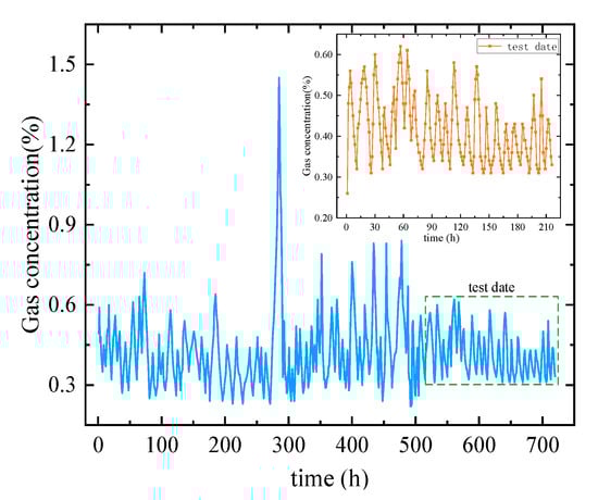 24], and the minimum sample size was estimated to be about 600 h based on certain empirical parameters. In selecting the sample size of the data, the gas concentration data were taken from the real-time air exhaust gas concentrations collected by the tunnel automatic monitoring system crossing the same coal seam working face, with a sampling time of 30 d in April 2022 and a time node of a 1 h equidistant interval, for a total of 720 > 600 h.