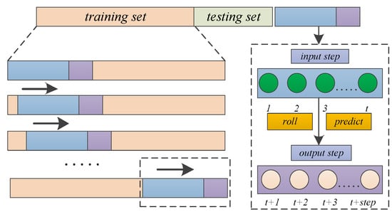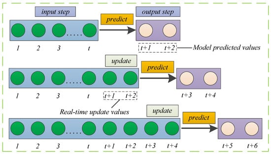 28]; where m = input step + output step, the input step is the sub-length of the training data sequence, and the output step is the predicted sequence length. The prediction of gas concentration with different steps can be completed by inputting different steps, i.e., the prediction performance of the model with different steps can be studied by updating the input value through continuous sliding prediction by rolling prediction. Step = 1 is single-step prediction; step ≥ 2 is multi-step prediction. The rolling prediction diagram is shown in