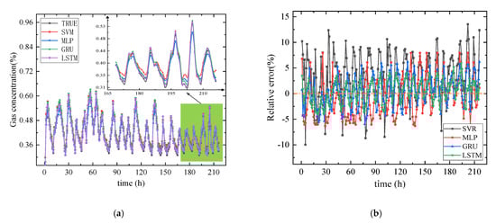 Figure 4a demonstrates that the four prediction models fit in a descending order from LSTM > GRU > MLP > SVR at the crest, trough, extreme value point, and inflection point. The relative errors of SVR and MLP are within 12% and 8%, respectively, as can be shown from