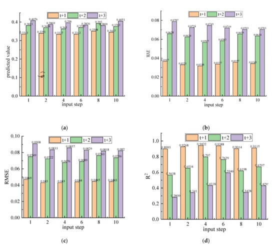 Figure 5, when the input step length was 2~8, the model had a better prediction effect under the evaluation index in 3, which also verified that neither the larger the input step length nor the smaller the input step length resulted in the highest prediction accuracy. However, the difference between the MAE and RMSE evaluation index values under different output step lengths was not significant at time t+1. From the curve fitting degree determination coefficient R