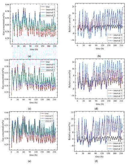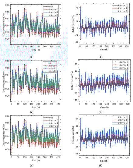 Figure 6b,d,f. Meanwhile, the relative error of interval 0 step (interval 0) varied at 5% with excellent accuracy, that of interval 1 step (interval 1) was roughly two to five times bigger, and that of the prediction effect of interval 2 step (interval 2) was considerably higher.