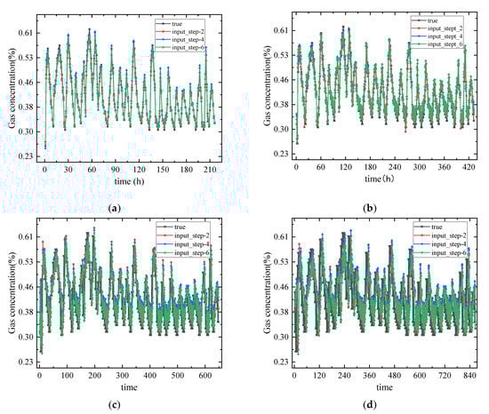 21]. Therefore, it was important to use appropriate input steps for predicting gas concentration trends in order to better suit the prediction needs of each work process in the actual project and to reduce the complexity of the training model. Considering that the duration of each construction process on site was 2–4 h, this made the data inherently random, periodic, fluctuating, and mutable. In order to better meet the prediction requirements of each work process in the actual project and to lessen the complexity of the training model, it was critical to select the appropriate input step length for predicting gas concentration trends. The data were intrinsically random, periodic, variable, and mutable because each construction process on site lasted between two and four hours.