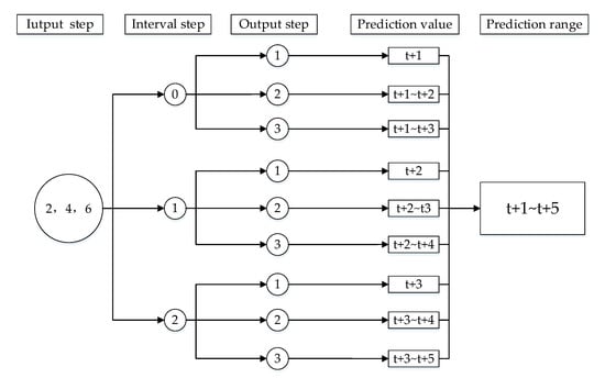 Figure 2. Single-step prediction, also known as one-dimensional one-step prediction, is based on one-dimensional time series, using the previous steps (previous hours) as the input variable interval n steps (interval several hours) to predict the average gas concentration of a future step (a certain hour). Multi-step prediction is also called single-dimensional multi-step prediction, which means that the average gas concentration of a certain step in the future is predicted by using the previous steps as the input variables and interval n steps, where interval 0 steps are multi-step continuous prediction.