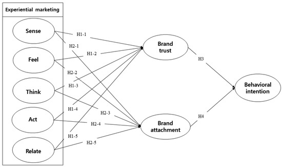 The current shifting of customer segments from international tourists to domestic ones necessitates the better understanding of their post-purchase behaviors and formulation of corresponding marketing strategies. A clear marketing strategy is crucial for a company to achieve competitive advantages and sustainable growth [5]. As a relatively new marketing paradigm, experiential marketing focuses on motivating customers’ purchasing decisions by offering multidimensional memorable experiences [6]. Brand attachment and brand trust, as the main objectives of brand management, represent the level of consumer–brand relationships [7]. This customer–brand relationship, formed by customers’ experience and perception of the brand, is the final affective response to a brand. Previous studies have applied experiential marketing and brand marketing to various consumption settings, such as the cultural and creative industry [8], online business [9], luxury product consumption [10], and tourism industry [11], and have confirmed the effectivity of the above two marketing strategies on encouraging customers’ purchase behaviors.