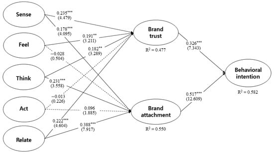 Figure 3 shows that sense (β = 0.235, p < 0.001), feel (β = 0.191, p < 0.01), think (β = 0.182, p < 0.01), and relate (β = 0.222, p < 0.001) positively affected brand trust, while act did not affect brand trust significantly, thus, supporting Hypothesis 1-1, Hypothesis 1-2, Hypothesis 1-3, and Hypothesis 1-5, except for Hypothesis 1-4. Meanwhile, sense (β = 0.178, p < 0.001), think (β = 0.182, p < 0.01), and relate (β = 0.222, p < 0.001) positively affected brand attachment, while feel and act did not affect brand attachment significantly. Therefore, Hypothesis 2-1, Hypothesis 2-3, and Hypothesis 2-5 were confirmed, while Hypothesis 2-2 and Hypothesis 2-4 were rejected. Additionally, brand trust (β = 0.326, p < 0.001) and brand attachment (β = 0.517, p < 0.001) positively affected behavioral intention. Hence, Hypothesises 3 and 4 were supported.