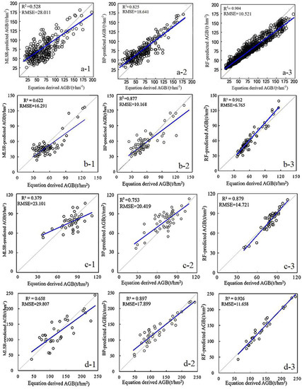 Comparison of biomass validation results of four forest types estimated using three estimation methods. (a-1–a-3) Biomass validation results of mixed forest multiple stepwise regression, BP neural network and random forest models; (b-1–b-3) biomass validation results of multiple stepwise regression, BP neural network and random forest models for Pinus massoniana; (c-1–c-3) biomass validation results of multiple stepwise regression, BP neural network and random forest models for Pinus elliottii; (d-1–d-3) biomass validation results of multiple stepwise regression, BP neural network and random forest models for Quercus acutissima.