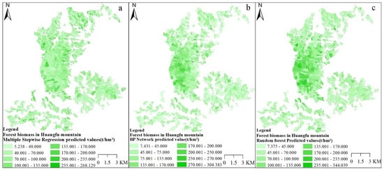 Figure 4 shows the spatial distribution of forest biomass in Huangfushan, with biomass values ranging from 5.238 t/hm2 to 344.039 t/hm2. The difference between the three estimation models is obvious, and the difference was significant in the central forest area. The multiple stepwise regression model underestimated the high value in the central forest area. The random forest model had the best effect on the estimation of a high biomass value, with the highest biomass value reaching 344.039 t/hm2.