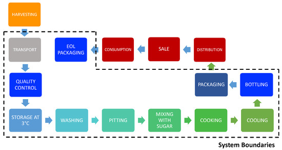 This section details the methodology adopted to compare the environmental impacts of different processes and transportation practices in apricot jam production by means of an LCA analysis according to the requirements of ISO 14040 [22] and ISO 14044 [23] standards with a “gate-to-gate” and “gate-to-grave” approach.