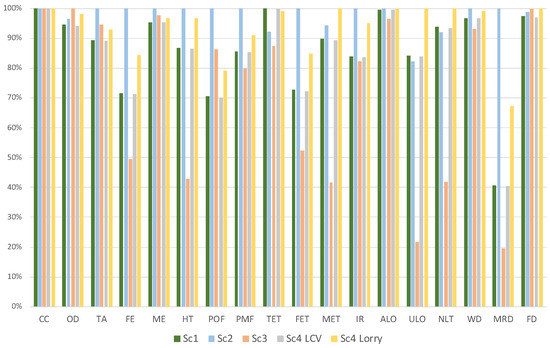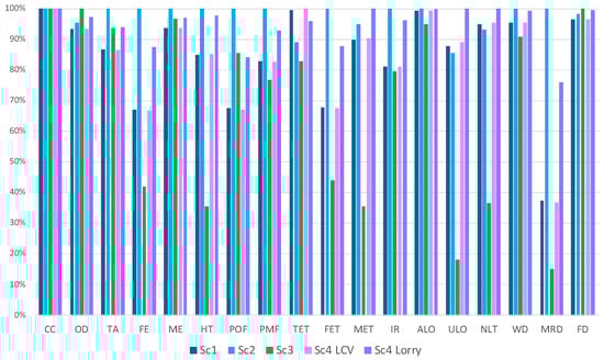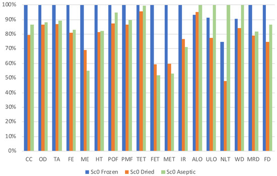 Analogously, the results of the impact comparison for the ‘Max’ threshold limit values are shown in Figure 8 for all the considered scenarios. In the case of the ‘Max’ threshold limit values, the scenarios (Sc1–Sc4) are characterized by the same value in the CC impact category as the scenario Sc0, in which frozen apricots are adopted as raw material (see Figure 5). Relative impact values are shown in Figure 8.