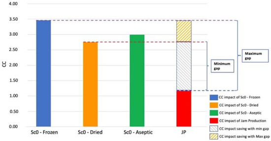 In the following, results obtained for the CC impact category are detailed. The reason for focusing attention on it is its greater effect in environmental terms than the other impact categories (see Table A1). In Figure 5, CC impacts due to jam production, adopting the semi-finished products (Sc0), are compared with those of jam production starting from fresh apricots (JP), without considering transportation and FLW generation percentage. As expected, the comparison shows that jam production from fresh fruit is less impactful than jam production starting from semi-finished products. Moreover, it is possible to identify an amount of “emissions saved” corresponding to the gap between the emissions generated from the production of fresh fruit and the emissions from jam production using dried apricots (minimum gap). Similarly, the amount of saved emissions is greater in comparison with the emissions generated by jam production using frozen apricots (Figure 5). Analogous considerations can be extended to other impact categories calculated with the ReCiPe methodology.