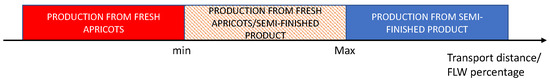 Figure 6 depicts concisely the concept of environmental convenience limits, in terms of transport distance and FLW percentage, of the jam production process starting from fresh apricots (in the different scenarios Sc1–Sc4), in comparison with the two production processes starting from the semi-finished products (dried and frozen apricots), on the basis of the minimum and maximum values (‘Min’ and ‘Max’) reported in Table 4.