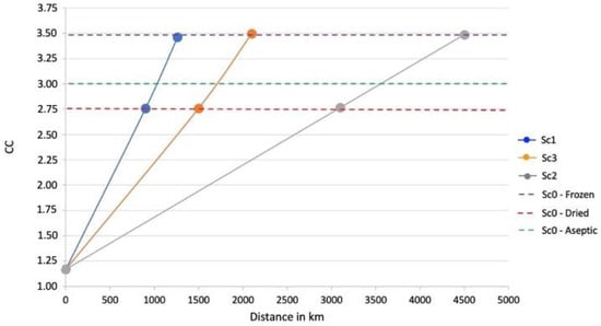 As discussed in Section 2, for a reliable evaluation of impacts due to the production of apricot jam from fresh fruit, it is necessary to consider both transportation and FLW generation. As transportation distance and FLW generation percentage increase, the impacts also increase. Since the aim of the analysis conducted is to identify the most sustainable configuration of apricot jam production, the impacts of all the scenarios considered (Sc1–Sc4) have been compared with the impacts of the scenario Sc0. The comparison is based only on the CC impact category, which is the most relevant. The comparison leads to identifying, for each of the scenarios Sc1–Sc4, the threshold (maximum) values of transport distance (Sc1–Sc3) and FLW percentage (only in Sc4) for which the impacts are equal.
