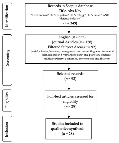 The search was carried out in Elsevier´s Scopus database, with article title, abstract and keywords (TITLE-ABS-KEY) to identify peer-reviewed journal articles in English. The search terms were TITLE-ABS-KEY “environment” OR “ecosystem” OR “climate” AND “defense industry”. Usually, SLRs employ more than one database [28]. However, we only used a single database since the objective was to achieve more objectively the characteristics of SLRs, which are: transparency, replicability and ease of access [29]. Scopus was selected as the largest international and multidisciplinary research database of peer-reviewed manuscripts [27]. An additional argument that justifies the use of Scopus is the coverage of journals in the area of Natural Sciences and Engineering [30,31], areas typically associated with the defense industry. To refine our research, we used the PRISMA protocol. Thus, in August 2022, Scopus yielded 349 manuscripts (Figure 1). We only included manuscripts in English, for reasons of textual comprehension and interpretation and journal articles for quality reasons (n = 128). Additionally, we only included articles from non-technical areas, namely: social sciences; business, management and accounting; environmental sciences; arts and humanities; earth and planetary science; multidisciplinary; economics, econometrics and finance. Once the process was concluded, 92 scientific articles were obtained. In the eligibility phase, all article abstracts were read carefully to exclude articles for which we did not have access to the full text (n = 8), technical articles (n = 7) and articles that had no specific relationship with the topic (n = 49). As no articles other than those from the Scopus search were included, we ended up with the approval of 28 articles for review (Table S3).
