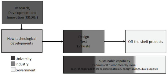 However, the existing literature is somewhat scattered; in general, from the articles analyzed, we identified specific constructs focused on research, development and technological innovation (R&D&I). Technologies coming from the triple helix innovation model—where universities, industry and governments play an active role—are tested and evaluated for use by stakeholders (e.g., the armed forces). The attributes and characteristics of off-the-shelf products are expected to be a guarantee of sustainability and transition to a greener industry. The case study presented in the next sections validated the conceptual model above (Figure 2); however, a new relevant construct was added that had not been previously addressed in the defense industry literature.