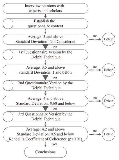 Delphi technique is applied in various related research fields [50,51]. When the background knowledge of the Delphi technique is used, and there are more than ten experts, the minimum group error and highest credibility can be achieved [52]. A consensus can be effectively established when the standard number of expert scholars required to reach a consensus is 10 to 15 [53,54]. Therefore, a total of 12 experts and scholars were invited to form the Delphi technique panel in this study. Anonymity is required during the interview process to avoid interpersonal communication complexities that may interfere with objective responses. Anonymity is necessary to prevent the psychological factors of authoritarian submission or a bandwagon effect caused by group leadership positions or hierarchical relationships [55]. The anonymity allows the expert panel members to express their genuine opinions and positions, leading to various considerations at different levels, making the experts’ opinions and arguments more objective. This shows that joint decisions resulting from collective discussions are more comprehensive than conclusions reached by individual thinking [56]. The subsequently summarize and analyze these experiences, and the questionnaire items are developed for the next round accordingly.
