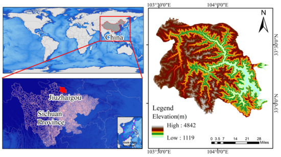 Jiuzhaigou County (32°54′ N~33°19′ N, 103°46′ E~104°4′ E) is located in the Aba Tibetan and Qiang Autonomous Prefecture, Sichuan Province, China, bordering the Wenxian, Zhouqu, and Dibu counties of Gansu Province. The south and west of the study area are bordered by Pingwu, Songpan, and Zoige of Sichuan Province, with a total area of about 5290 km2. The valley of Jiuzhaigou County is vertical and horizontal, and the terrain is high in the northwest and low in the southeast. It is mainly dominated by mountains, and some mountains are plain and flat dams. The altitude difference is up to 2000 m. Jiuzhaigou is located in the transition zone from the Qinghai–Tibet Plateau to the Sichuan Basin, with a complex geological background and strong neotectonic movement. According to altitude, the study area is divided into warm temperate semi-arid, middle temperate, and cold temperate monsoon climates. The average annual temperature is 12.7 °C and the average annual precipitation is 550 mm. At 21:19 on 8 August 2017, a 7.0 magnitude earthquake occurred in Jiuzhaigou County, Aba Prefecture, Sichuan Province (33.20 N, 103.82 E), with a focal depth of 20 km. The maximum intensity of the earthquake was nine degrees. The geographical location of the study area is shown in Figure 1.