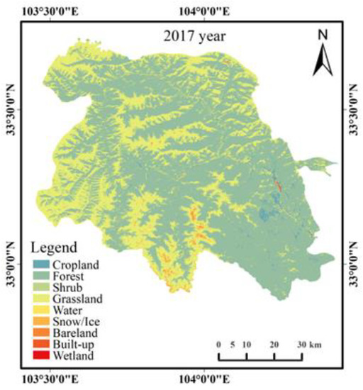 The land cover data used in this study came from the annual land cover data of 30 m in China produced by Professor Huang Xin’s team at Wuhan University [32]. This data collected the training samples by combining stable samples extracted from China’s land-use/cover datasets (CLUDs) and visually interpreted samples from satellite time-series data, Google Earth, and Google Maps. Using 335,709 Landsat images on the GEE, several temporal metrics were constructed and fed to the random forest classifier to obtain classification results. Considering the land cover distribution in China [33], this data defined a classification system including nine major LCs, as follows: cropland, forest, shrub, grassland, water, snow and ice, barren, impervious, and wetland. This classification system is similar to that of FROM_GLC [34], and can be conveniently remapped to the FAO (Food and Agriculture Organization) and IGBP systems. After obtaining three periods of land cover data, namely pre-earthquake (2015), earthquake year (2017), and earthquake recovery period (2020), WGS UTM projection was used as the reference frame for the analysis in this paper. Figure 2 shows the land cover data of each period covering the study area.