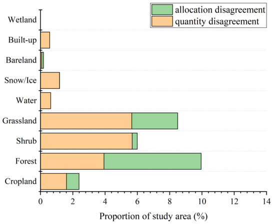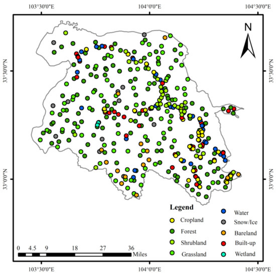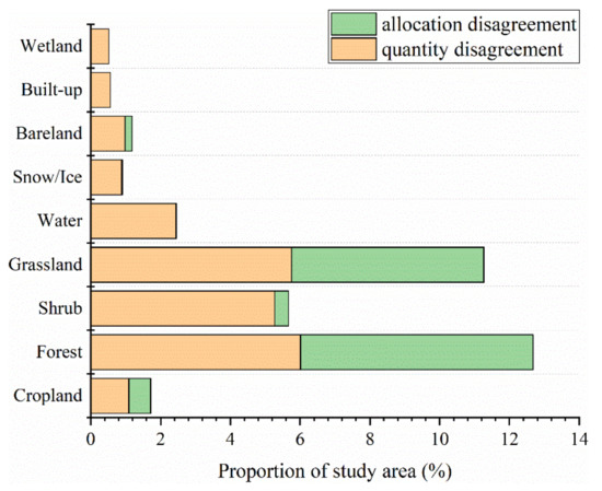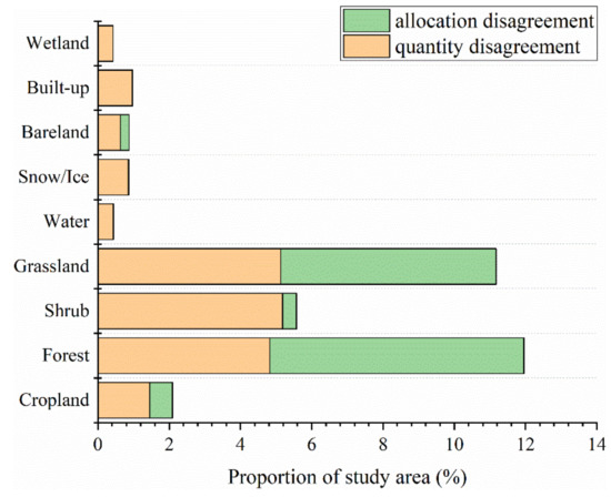 A confusion matrix is a commonly used method to evaluate the classification accuracy of remote sensing images, which expresses the classification results of sample data and the comparison results of actual ground classes with an n × n dimensional matrix [35,36,37]. The columns in the confusion matrix represent the actual category and the rows represent the predicted category. In this paper, the overall accuracy (OA) and Kappa coefficient were used to evaluate the accuracy [38]. Furthermore, sample points for accuracy verification of land cover data in each period were collected based on Google Earth (Figure 3 is the sample points collected in 2020), and then the confusion matrix was used to calculate the overall accuracy and Kappa coefficient of land cover data in 2015, 2017, and 2020, respectively. Thus, the accuracy of land cover data is evaluated (Table 1). Table 1, Table 2 and Table 3 show that the overall accuracy of the land cover data of the three periods is higher than 82%. According to the classification accuracy relation corresponding to different quantity disagreement and allocation disagreement values [39] (Figure 4, Figure 5 and Figure 6), the land cover data of the three periods obtained in this paper have good accuracy and can meet the research needs of this paper.